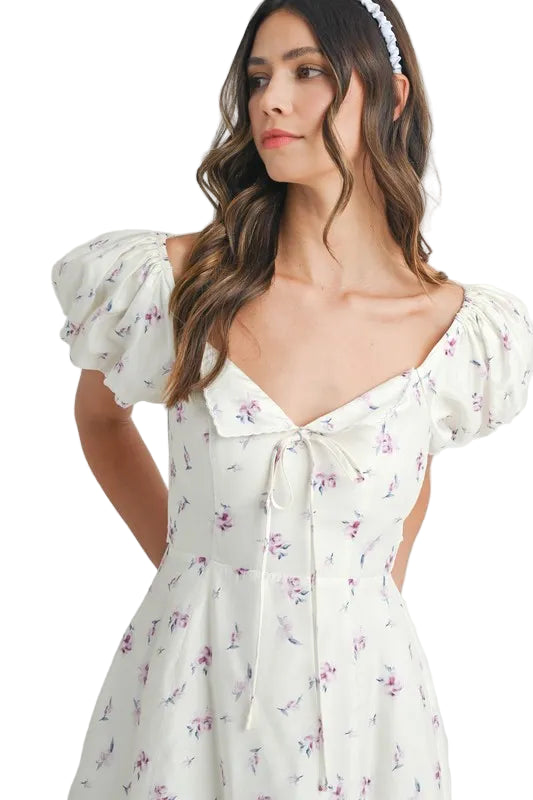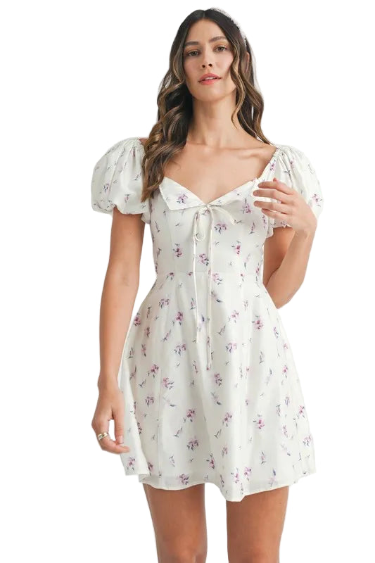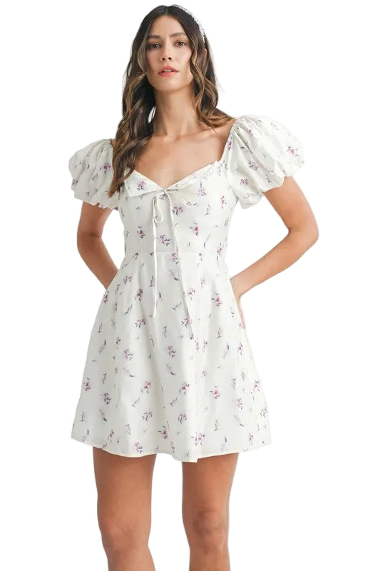 Delicate and romantic, this white mini dress is adorned with a subtle floral print in soft pastel tones. The sweetheart neckline is accented by a dainty front tie, while voluminous puff sleeves add a playful, vintage-inspired charm. A fitted bodice and gently flared skirt create a flattering silhouette, making it perfect for picnics, brunch dates, or sunny day strolls. Pair with strappy sandals for an effortlessly feminine look.