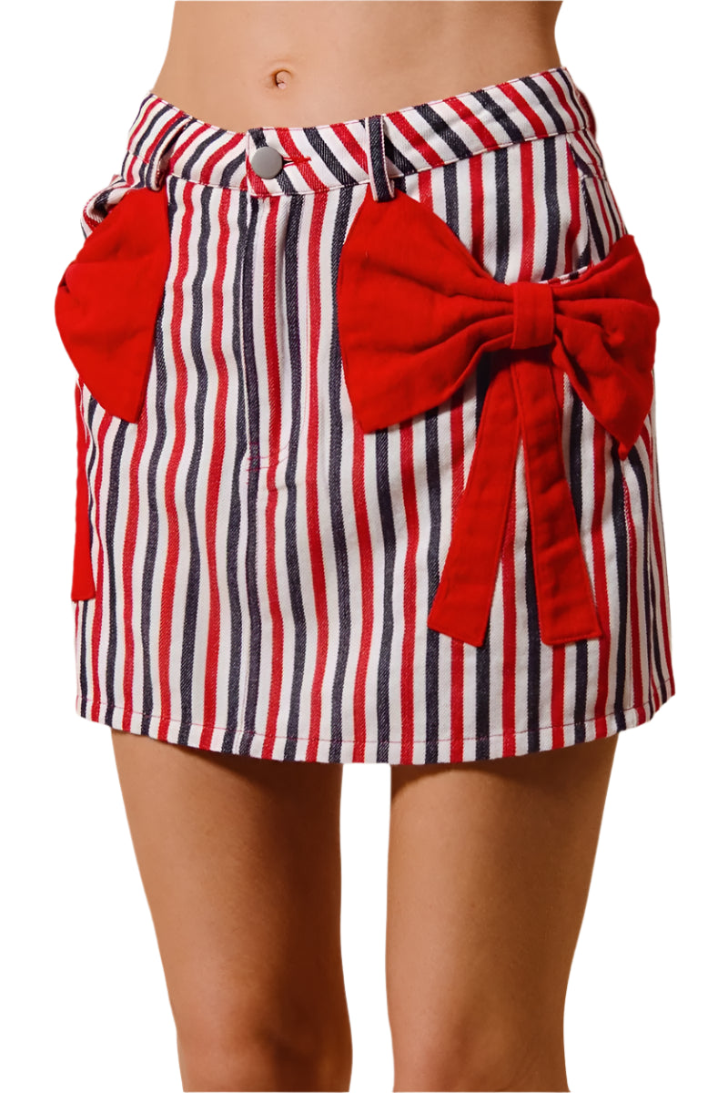 The Rebel Skirt is a flirty twist on classic gameday style. Featuring bold red, white, and navy vertical stripes in a lightweight denim, it’s both stylish and easy to wear. The eye-catching oversized red bow details add a playful, feminine flair, while the flattering high-waisted fit elongates your silhouette. Perfectly mini in length, it’s ready for tailgates with sneakers or post-game celebrations with boots. An elastic waistband keeps it comfy all day, making it the go-to piece for fashion-forward babes who want standout style without sacrificing comfort.