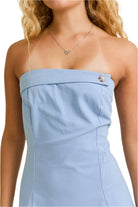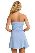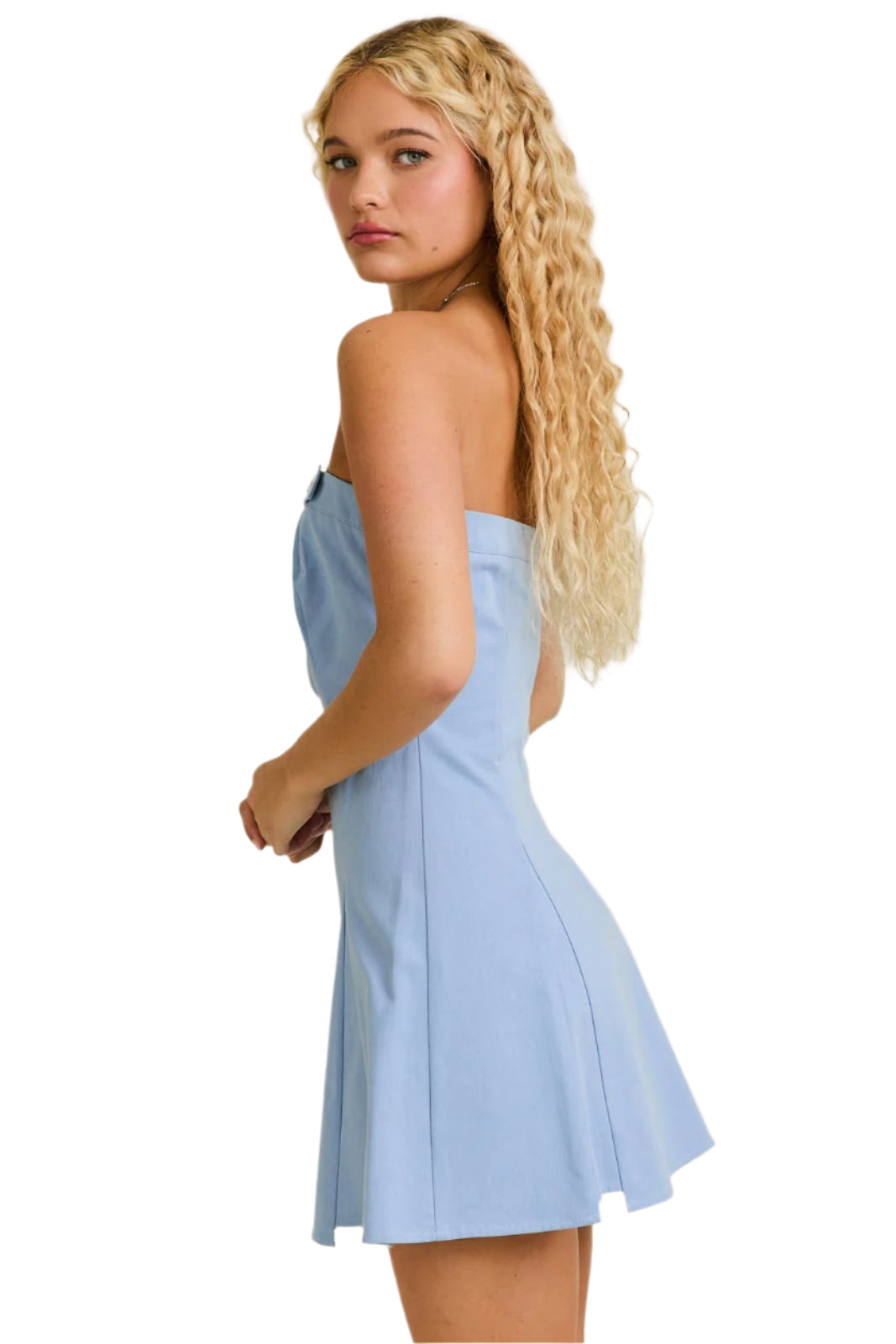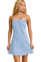 This light blue strapless mini dress is a chic and effortless choice for any social occasion. With its clean lines, fitted bodice, and subtly flared skirt, it creates a flattering silhouette that’s both timeless and versatile. Perfect for brunch with friends, game day celebrations, or any social gathering, it pairs beautifully with sneakers for a casual vibe or heels for a more polished look. Easy to style and endlessly wearable, this dress is your go-to for looking put-together without overthinking it.