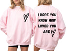 Our Know How Loved You Are Crewneck is a soft gray sweatshirt with a minimalist heart design on the front and an uplifting message on the back — “I HOPE YOU KNOW HOW LOVED YOU ARE.”