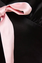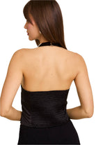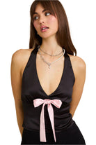 Turn heads in this cute halter top, featuring a deep V-neckline that’s equal parts daring and elegant. The silky black fabric drapes effortlessly, while a soft blush-pink bow at the center adds the perfect touch of feminine charm. Finished with an open back and a figure-flattering fit, this piece transitions seamlessly from date night to girls’ night.