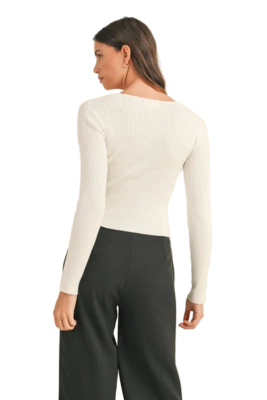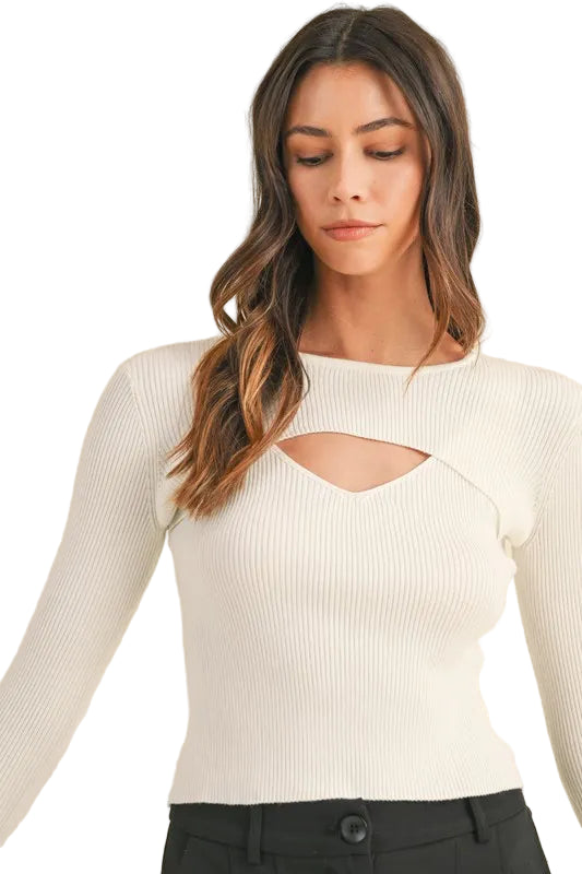 This cut out long sleeve ribbed knit top is a modern and edgy piece that adds a unique twist to your outfit. The cut out detailing gives it a contemporary and stylish look, perfect for a statement piece. Elevate your style with this trendy ribbed knit top that offers a chic and fashion-forward silhouette.