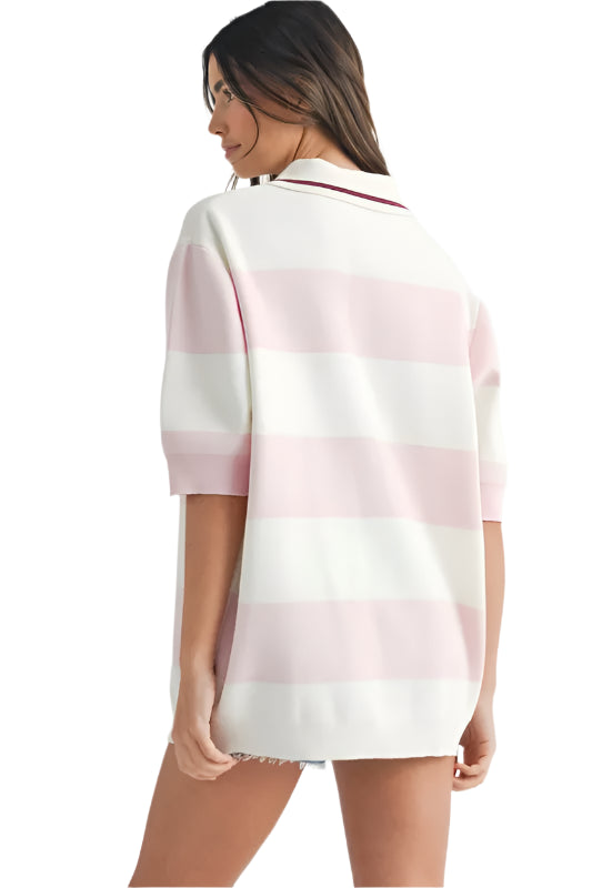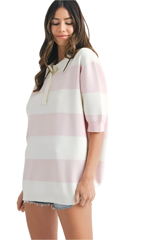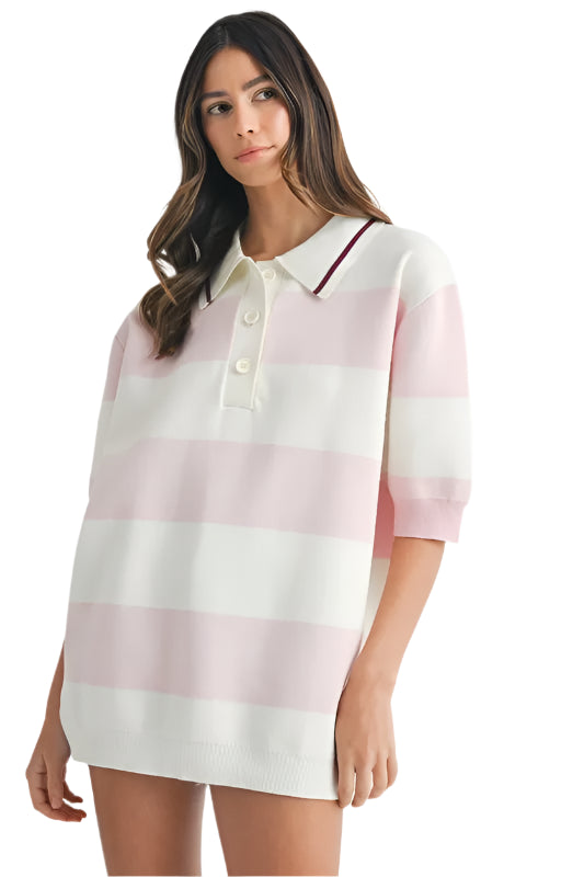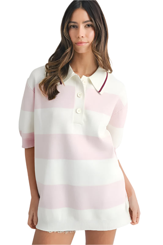 Slip into effortless style with our Study Hall Sweetie Sweater – the ultimate blend of cozy comfort and laid-back chic. Featuring wide pastel pink and white stripes, a soft knit texture, and a relaxed oversized fit, this sweater is perfect for casual mornings, beach strolls, or coffee runs in style. The collared neckline and button-front polo design add a sporty, preppy twist that keeps things playful yet polished.