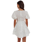 Flutter into style with this dreamy white mini dress! This dress is the perfect blend of romantic and chic, featuring a delicate eyelet lace fabric and a plunging V-neckline. The sweet puff sleeves add a touch of whimsy, while the fitted waist and flared skirt create a universally flattering silhouette. Whether you're dressing up for a special occasion or looking for the perfect piece for a sunny day out, this dress is sure to have you feeling radiant and beautiful!
