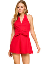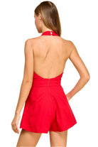 Bold, sleek, and effortlessly flirty, this vibrant red romper is a statement piece for any occasion. Designed with a halter neckline that creates a flattering plunge, it cinches at the waist with a chic front tie detail that accentuates your shape. The flowy shorts give it a playful, skirt-like silhouette, while the open back adds just the right touch of allure. Perfect for date nights, rooftop cocktails, or turning heads at your next event.