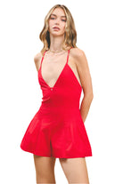 Turn up the heat in this bold red romper, designed to make a statement. Featuring a daring deep V-neckline with delicate spaghetti straps, it offers a sleek, figure-flattering fit through the bodice before flaring into playful, flowy shorts. Perfect for nights out, special occasions, or anytime you want to stand out, this one-piece combines flirty charm with effortless confidence.