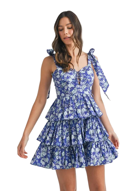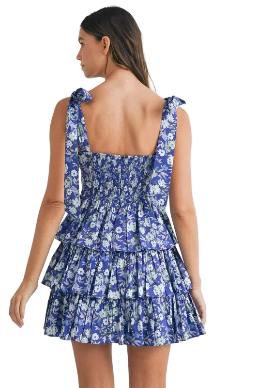 Playful and flirty, this vibrant blue mini dress blooms with an allover white floral print. Adjustable tie straps add a charming touch while allowing for a customized fit, and the smocked bodice ensures all-day comfort. The tiered, ruffle skirt brings volume and movement, making it perfect for sunny day outings, casual parties, or weekend getaways. Pair with sneakers for a relaxed vibe or dress it up with wedges for a chic look.