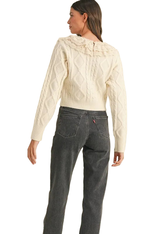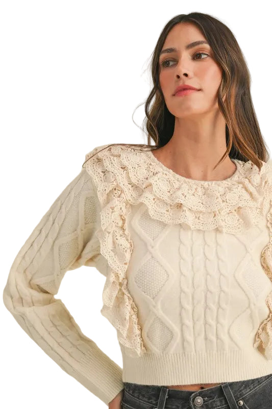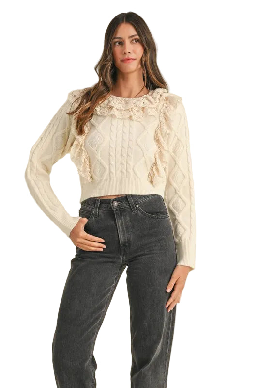 Cozy meets feminine charm in this cream-toned cable-knit sweater, adorned with soft ruffle accents along the shoulders and chest for a touch of romantic flair. The classic knit pattern adds texture and warmth, while the slightly cropped silhouette makes it perfect for pairing with high-waisted jeans or skirts. Ideal for transitioning seasons, this sweater effortlessly balances casual comfort with elevated style.